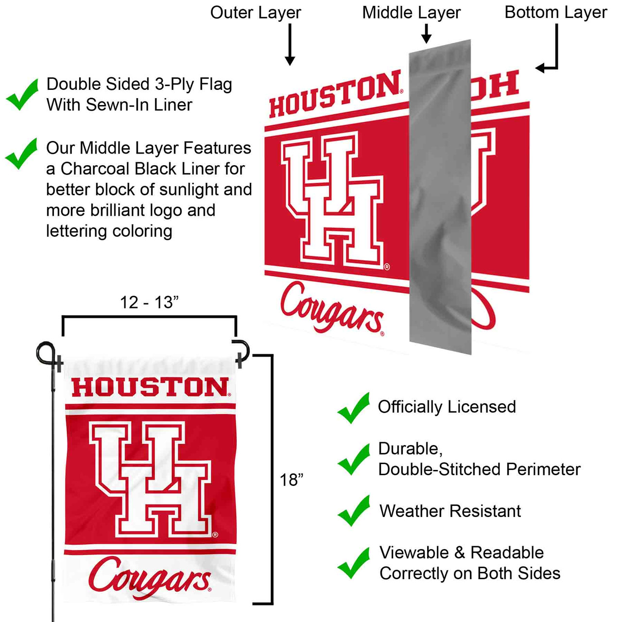 This Flag, Banner or Pennant is an ideal set for your yard or home entrance. It includes your selected 13 in x 18 in Double Sided UH Cougars Garden Flag along with a Sturdy Steel Powder Coated Garden Flag Stand with 2 included Rubber Stoppers. The garden flag measures 13 in x 18 in, is made of 2-ply Polyester with Sewn-In Liner, is Screen Printed, has a top pole sleeve for inserting the included Garden Flag Stand, and the logos are Viewable and Readable Correctly on Both Sides. The Garden Flag Stand measures an assembled height of 40" and has a flag crossbar width of a large 17". Also, the stand is made of steel, is powder coated black for rust resistance, and the ground stake is made with double welds for extra durability. A unique gift, our Flag, Banner or Pennant is ready to fly and no tools are needed for assembly. The Flag is Officially Licensed and Team, College, or University Approved Approved.