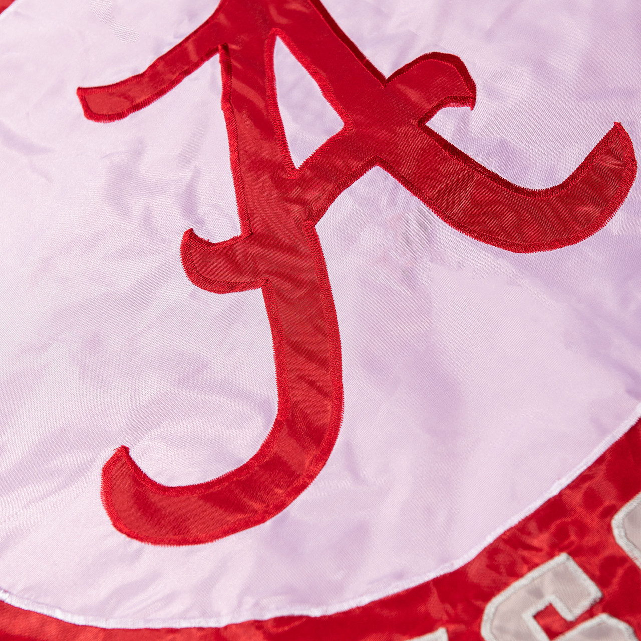 Our Flag, Banner or Pennant measures 3 ft x 5 ft in size, has Quadruple Stitched fly ends, is made of durable Nylon, and has two Metal Grommets for attaching to your flagpole. The Embroidered and Appliqued logos are applied via our 2-patch applique method, therefore, one patch is sewn on each side of the flag. These flags are Officially Licensed and College, University, or Team Approved and are Viewable from Both Sides (Opposite Side is a Reverse Image).