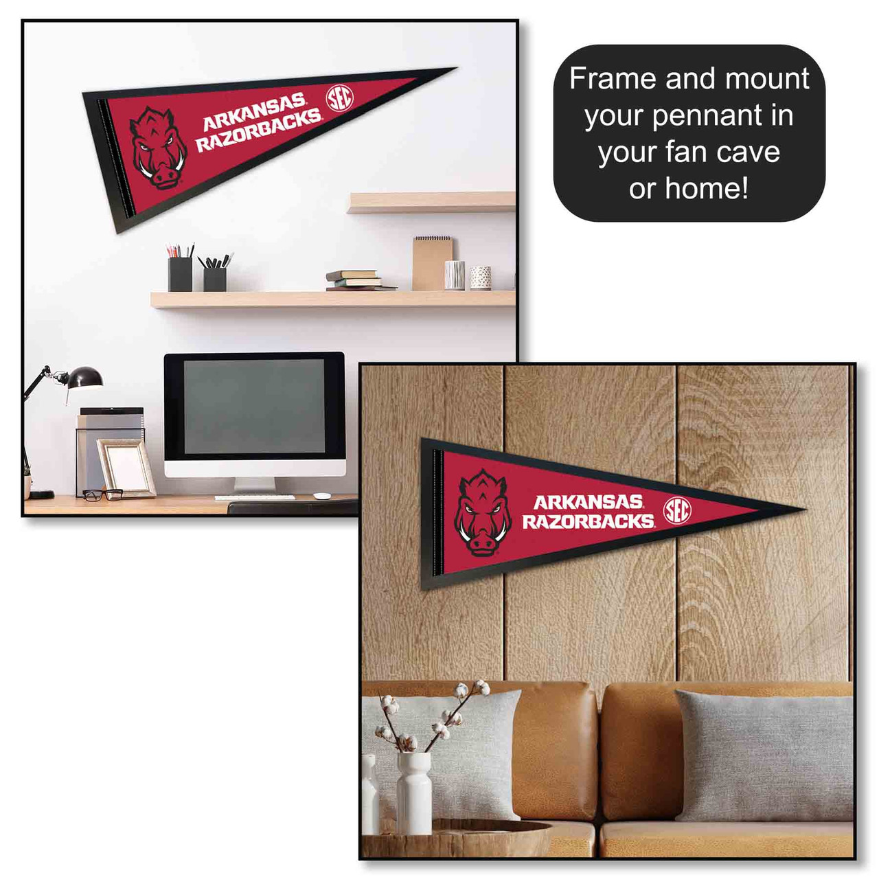Our Pennant Flag is a great way to show your college allegiance in your sports room, game room, office, bedroom, or any room by displaying as a wall banner. These pennants measure 12 in X 30 in, are made of Felt, and are single-sided Screen Printed with Razorbacks insignias and logos. Each Flag, Banner or Pennant is Officially Licensed and Team, College, or University Approved approved which insures current insignias, wordmarks, and authentic colors. These pennants also include a sewn pennant stick sleeve on the left side which can be used to insert a pennant stick, if desired.
