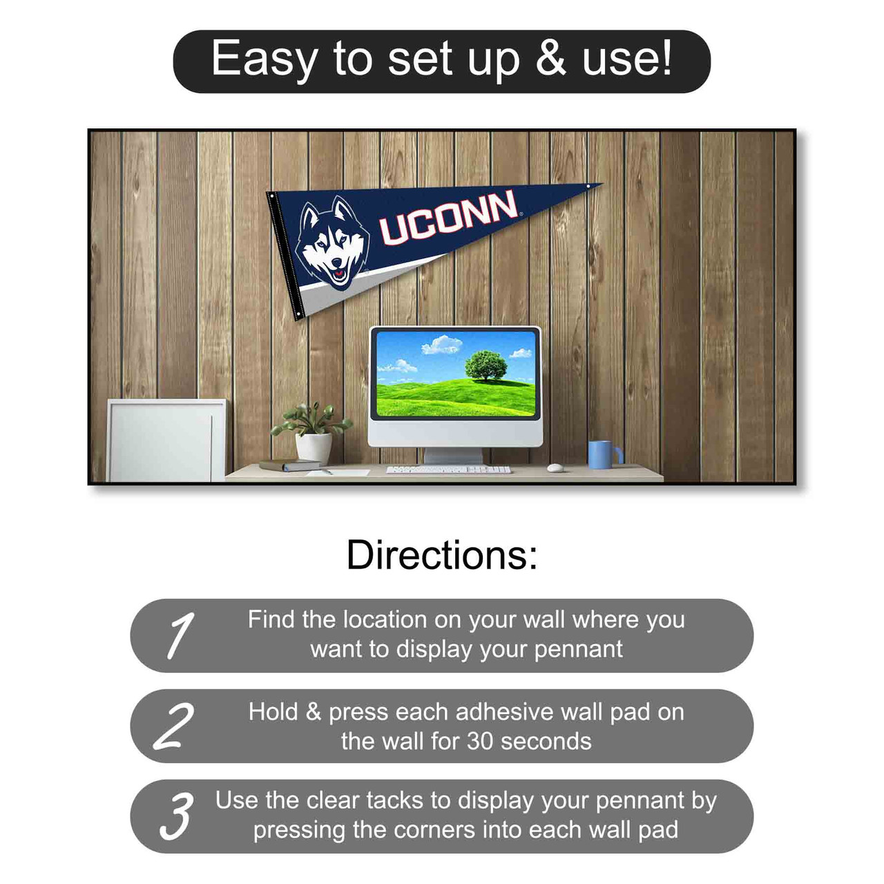 - Banner includes 12 in X 30 in Full Size Team Pennant and 6 adhesive mount pads and 6 clear tacks for displaying on any wall