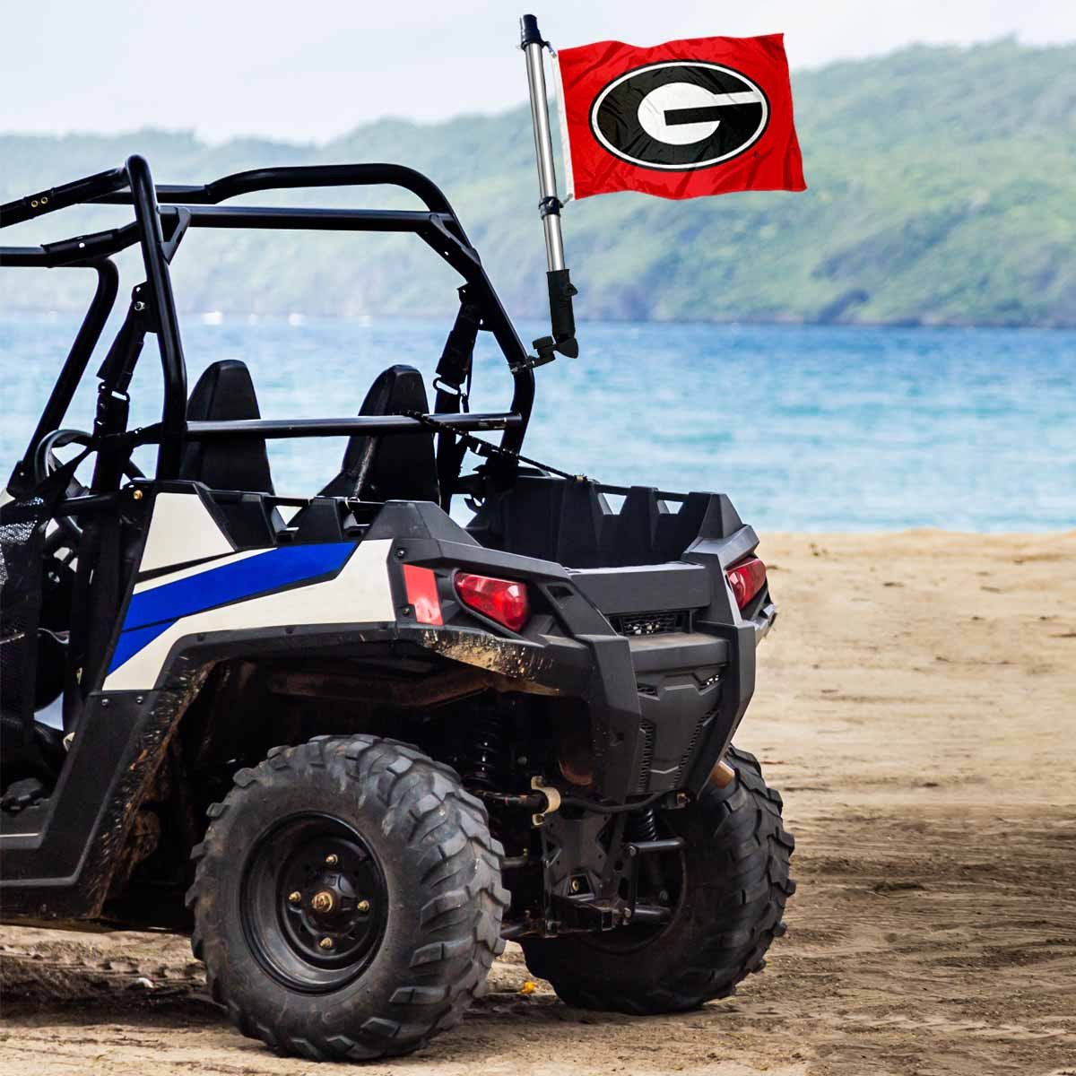 Our Georgia Bulldogs Golf Cart and Boat Flag measures 12x18 inches in size, has quadruple-stitched fly ends, is made of durable 2-ply double-sided polyester, and has two metal grommets for attaching to your boat mount, golf cart, motorcycle mount, or any of your uses. The screen printed University Georgia logos are Officially Licensed and Approved by University Georgia and are viewable and readable correctly on both sides.