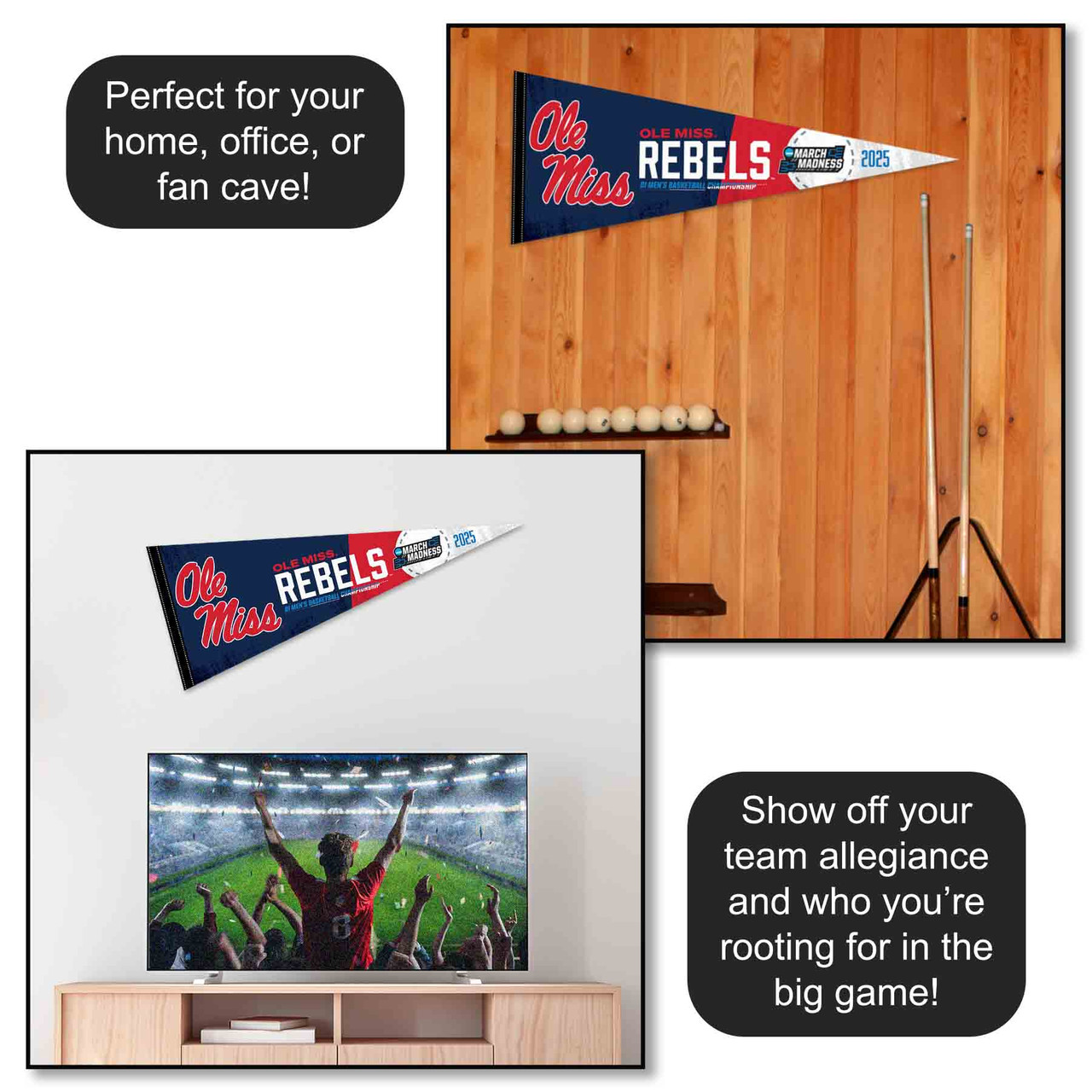 Our Pennant Flag is a great way to show your college allegiance in your sports room, game room, office, bedroom, or any room by displaying as a wall banner. These pennants measure 12 in X 30 in, are made of Felt, and are single-sided Screen Printed with Ole Miss insignias and logos. Each Flag, Banner or Pennant is Officially Licensed and Team, College, or University Approved approved which insures current insignias, wordmarks, and authentic colors. These pennants also include a sewn pennant stick sleeve on the left side which can be used to insert a pennant stick, if desired.