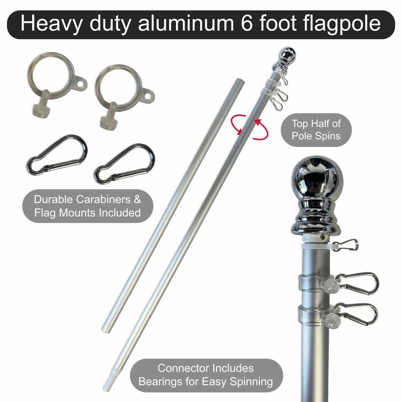 - 6' Flagpole is made of Aluminum, Spinning and Tangle Free Design, 2-Piece Connection, and includes all Flag Mounts and Clips, Imported