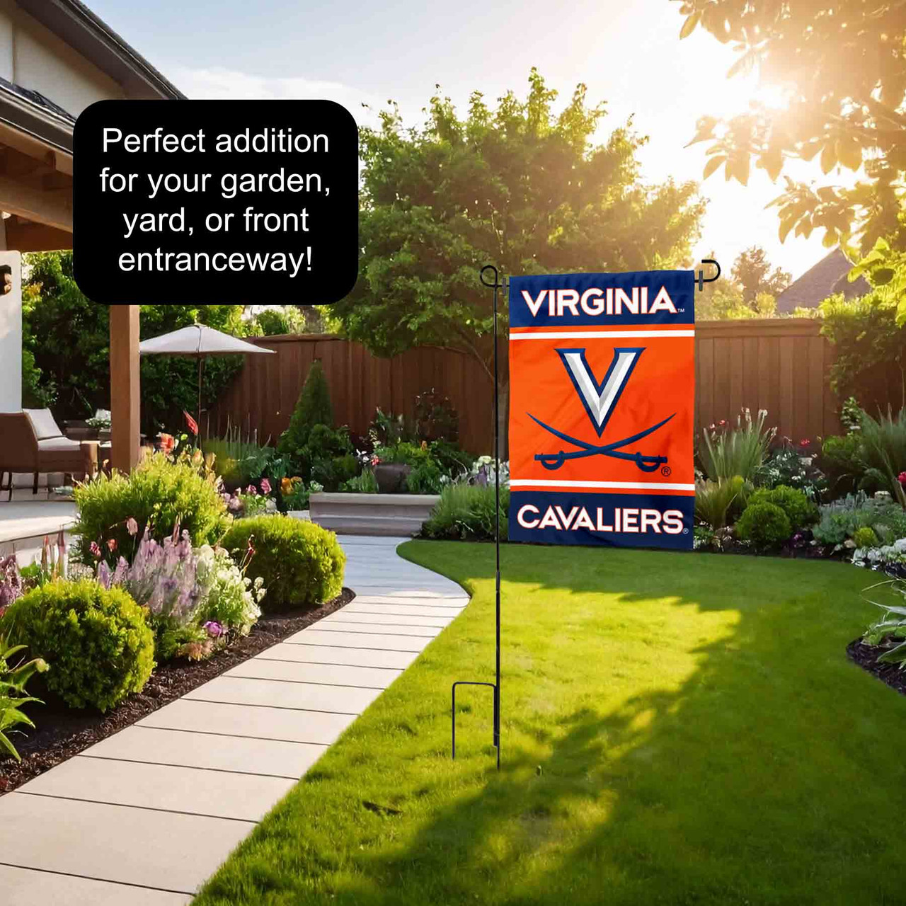 This Flag, Banner or Pennant is an ideal set for your yard or home entrance. It includes your selected 13 in x 18 in Double Sided Virginia Cavaliers Garden Flag along with a Sturdy Steel Powder Coated Garden Flag Stand with 2 included Rubber Stoppers. The garden flag measures 13 in x 18 in, is made of 2-ply Polyester with Sewn-In Liner, is Screen Printed, has a top pole sleeve for inserting the included Garden Flag Stand, and the logos are Viewable and Readable Correctly on Both Sides. The Garden Flag Stand measures an assembled height of 40" and has a flag crossbar width of a large 17". Also, the stand is made of steel, is powder coated black for rust resistance, and the ground stake is made with double welds for extra durability. A unique gift, our Flag, Banner or Pennant is ready to fly and no tools are needed for assembly. The Flag is Officially Licensed and Team, College, or University Approved Approved.